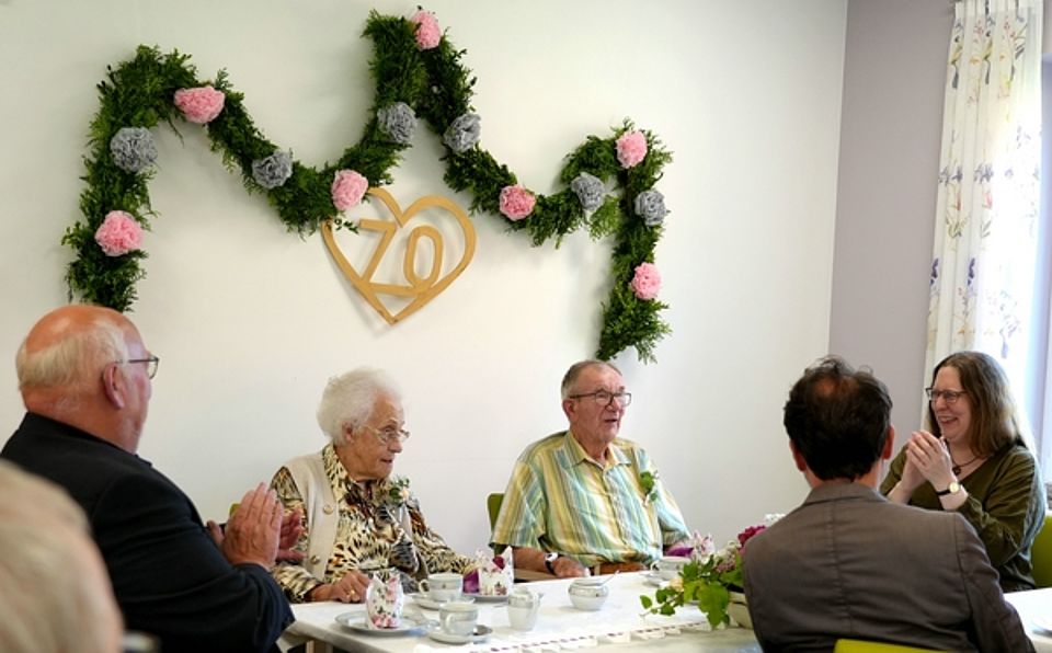 Für diesen besonderen Anlass hatte sich das Team der DRK-Tagespflege liebevoll vorbereitet: Gemeinsam mit einigen Tagesgästen wurde eine festliche Ehrengirlande gebunden, die über dem gemütlichen Ehrensofa ihren Platz fand. Der Tisch war festlich gedeckt, Kaffee wurde eingeschenkt und – auf Wunsch des Jubelpaares – durfte natürlich auch ein frisch gefüllter Butterkuchen nicht fehlen.
