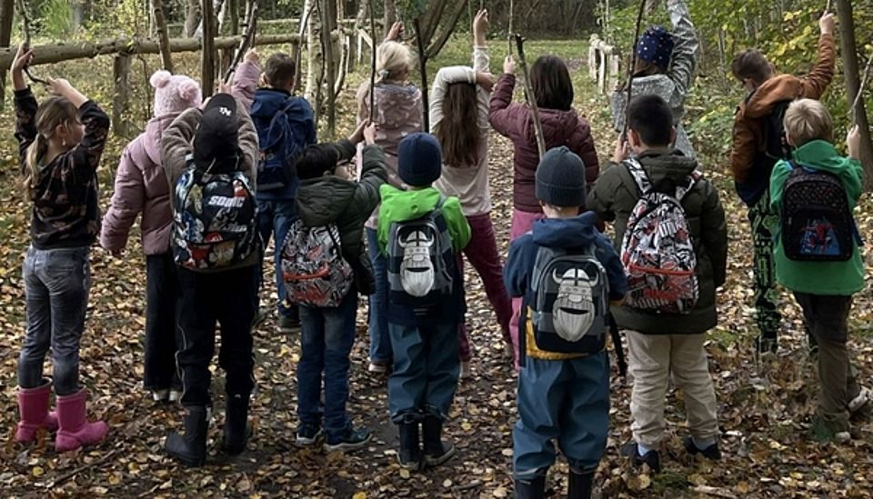 Außerdem sammelten die Kinder fleißig Stöcke, Blätter und andere kleine Waldschätze. Die Stöcke wollten wir später im Hort zu Fackeln basteln, die wir beim Laterne laufen verwenden können. So konnten wir den Wald gleich doppelt nutzen, zum Entdecken und zum Sammeln für unser nächstes Projekt.