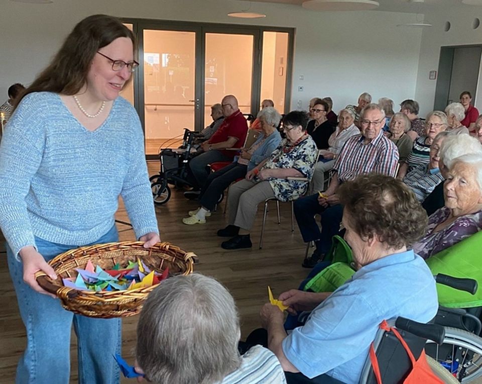 Sie brachte nicht nur eine schöne Predigt mit, sondern dazu passend auch selbst gefaltete Kraniche, die sie an die Bewohner verteilte. Auch ihr Mann brachte etwas mit: Eine neue Gitarre, die er stolz präsentierte und damit den Gesang begleitete.