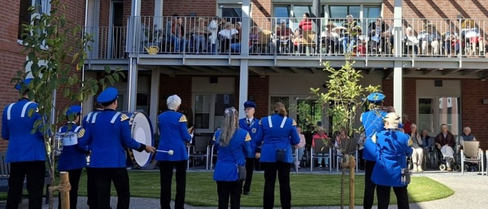 Diese Tradition haben sie beibehalten und auch dieses Jahr ein kleines Konzert für uns in unserem neuen Garten gespielt. Wie im Theater konnten unsere Bewohner im „Parkett“ auf der Terrasse sitzen, sowie im 1. Rang auf dem Balkon. Einige Bewohner nutzten auch ihre „eigene Loge“.