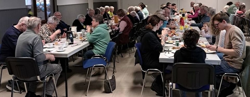 Rund 70 Hungrige hatten sich Anfang März im Dorfgemeinschaftshaus eingefunden, um vom Dorfladen und einigen Helferinnen liebevoll vorbereitete Wurst- und Käseplatten, Brötchen, teilweise selbstgemachtes Brot, Rührei, gespendete Salate und weitere Leckereien in geselliger Runde zu genießen.