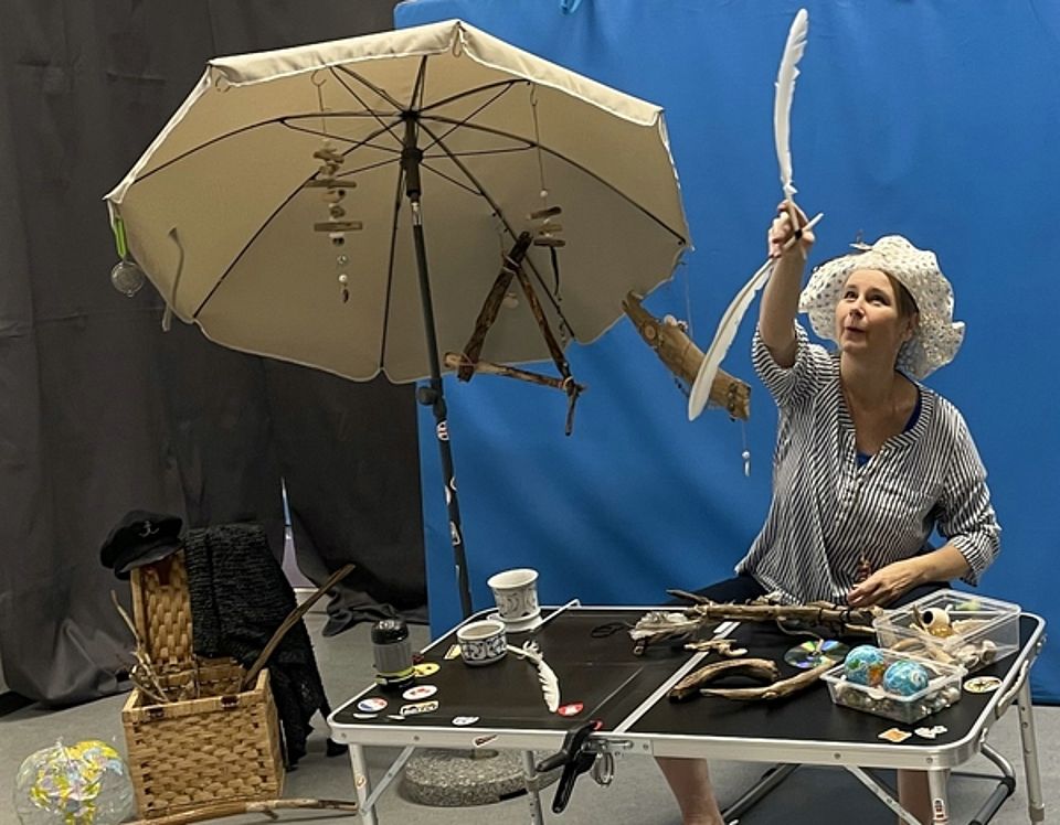 Dabei entstand nach und nach aus vielen einfachen Alltagsgegenständen eine fantastische Abenteuerwelt mit interessanten Figuren und einer spannenden Geschichte. Die liebevoll gestaltete Kulisse und die einfallsreichen Kostüme unterstützten die Fantasie der Kinder auf großartige Weise. Wie immer schaffte es Frau Hamann mit Witz und Gesang, Klein und Groß in ihren Bann zu ziehen. Wir werden noch lange an unsere Schatzsuche zurückdenken und freuen uns schon auf den nächsten Besuch von Frau Hammann.