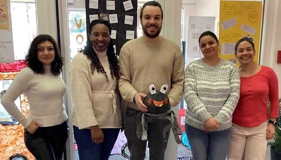 Englisch, Portugiesisch, Spanisch, Ukrainisch und Deutsch waren dann die Vorlesesprachen. Das Bilderbuch „Otto, die kleine Spinne“ wurde in den fünf Sprachen angefertigt. Als zusätzliche visuelle Unterstützung wurden die Eltern beim Vorlesen von einer päd. Fachkraft mit unterschiedlichen Materialien begleitet. Zum Einsatz kam das Kamishibai, die Erzählschiene, Fingerpuppen und Figuren im Schuhkarton.