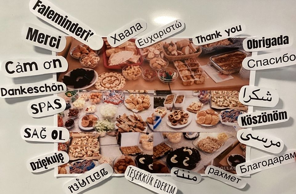 Passend zum Motto „Rund um die Welt“ wurden die unterschiedlichen Nationalitäten unserer Kinder und Erzieher*innen aufgegriffen – jeder Raum stellte ein anderes Land dar. Mit typischen Spielen, Tänzen, Musik und liebevoll gestalteter Dekoration konnten die Kinder verschiedene Kulturen entdecken. Ein besonderes Highlight war der Wegweiser, der die Richtungen in die verschiedenen Länder zeigte. Außerdem schmückte eine lange Girlande die Halle mit den Flaggen aller vertretenen Nationen. Gemeinsam mit den Kindern wurde eine große Erde genäht, die Kinder konnte sich selbst gestalten und rund um die Welt platzieren. So halten sich die Kinder symbolisch an den Händen – ein wunderschönes Zeichen dafür, dass wir zusammengehören, egal woher wir kommen. Auch unsere Cafeteria war an diesem Tag „International“. Familien aus verschiedenen Ländern brachten traditionelle Speisen aus ihrer Heimat mit. Es entstand ein vielfältiges und leckeres Buffet mit Spezialitäten wie portugiesischer Aletria (Milchreisnudeln), Baklava, gefüllten Weinblättern und vielem mehr.